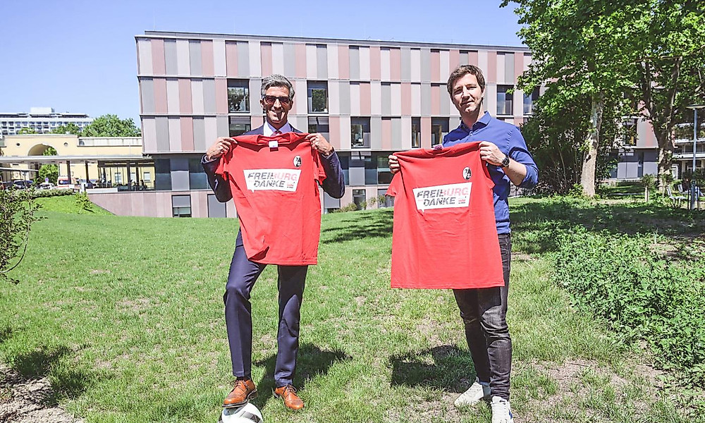 Das Freiburger Universitätsklinikum als Klinikpartner des SC Freiburg trägt dabei die Hauptlast in der Region. Aus diesem Grund übergab SC-Sportvorstand Jochen Saier am Dienstagmittag 1100 T-Shirts mit der Aufschrift „Freiburg sagt Danke“ an den Vorstandsvorsitzenden des Freiburger Universitätsklinikums, Prof. Dr. Frederik Wenz. Zudem erhalten die Mitarbeiterinnen und Mitarbeiter des Universitätsklinikums Freiburg 1100 Eintrittskarten für die Saisoneröffnung des Sport-Club im neuen Freiburger Stadion.