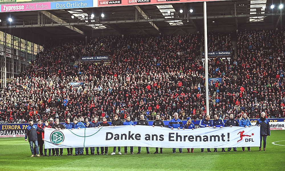 Im Anschluss machten sich die Fortbildungsteilnehmer auf den Weg ins Schwarzwald-Stadion. Dort präsentierten die Männer und Frauen vor dem Einlaufen beider Mannschaften ein „Danke ans Ehrenamt“-Banner auf dem Spielfeld. Dass der Sport-Club vor den Augen der Jugendtrainer die Partie mit 1:0 gewann, rundete den Tag, der ganz im Zeichen des Ehrenamtes stand, ab.