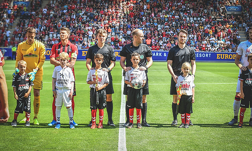 Alle Einlaufkinder haben sich eine Stunde vor dem Spiel vor dem Fanshop getroffen. Es war schon ganz schön was los ... Wir waren 25 Kinder für das erste Spiel gegen Cagliari Calcio. Überrascht war ich, dass Anton von meiner Mannschaft bei der DJK Tiergarten-Haslach auch als Einlaufkind dabei war. Wir sind dann zusammen mit den Betreuern vom SC Freiburg in die Umkleidekabine gelaufen und haben uns umgezogen.