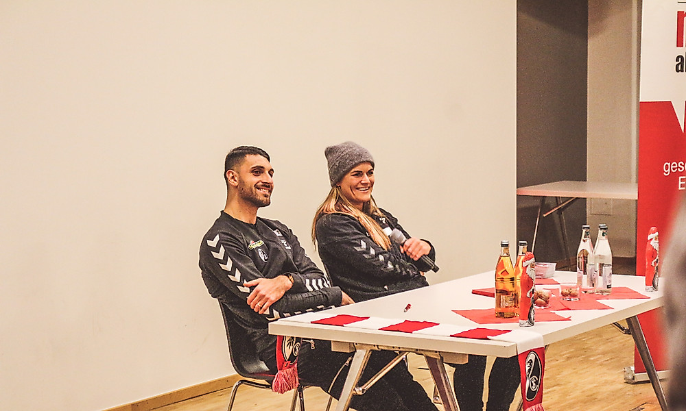 In der vitra.lounge im Schwarzwald-Stadion kamen rund 100 Füchsle- und Jugendclub-Mitglieder mit SC-Profi Vincenzo Grifo und Bundesligaspielerin Clara Schöne ins Gespräch. In lockerer Atmosphäre durfte der Fannachwuchs die beiden Kicker alles fragen, was ihn interessiert. Nachwuchsreporterin Laura Ernst berichtet vom launigen Frage-Antwort-Spiel: