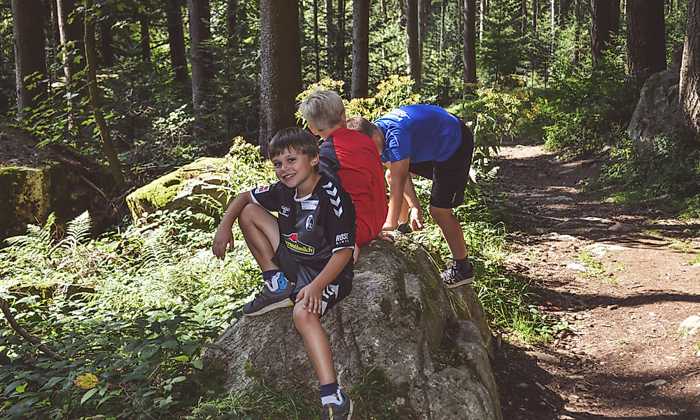 Wir trafen uns bei super Wetter um 14 Uhr in St. Wilhelm. Zuerst wurden wir in Teams aufgeteilt, die alle nach Spielern des SC Freiburg benannt waren. Ich war im Team Schmid. Dann machten wir uns auf den Weg den Wildnis-Erlebnis-Pfad zu erkunden. Der Wildnis-Erlebnis-Pfad ist ein Pfad durch den Wald, bei dem man an mehreren Stationen anhalten muss um Fragen zu beantworten. An einer Station musste man zum Beispiel auf einer Art Trainingsfahrrad treten um Strom zu erzeugen. Wenn man den grünen Punkt zum Leuchten gebracht hat, musste man auf einen Knopf drücken und dann kam aus den Lautsprechern ein Tierlaut und man musste erkennen was für ein Tier das ist. An einer anderen Station hat man gesehen wie weit verschiedene Tiere springen und man musste versuchen auch so weit zu springen. Das Tier, das am weitesten springen kann, war der Luchs. Nach dem Erlebnis-Pfad sind wir zurück zum Fußballplatz und dort gab es für alle eine frisch gegrillte Stadionwurst im Weckle und etwas zu trinken.