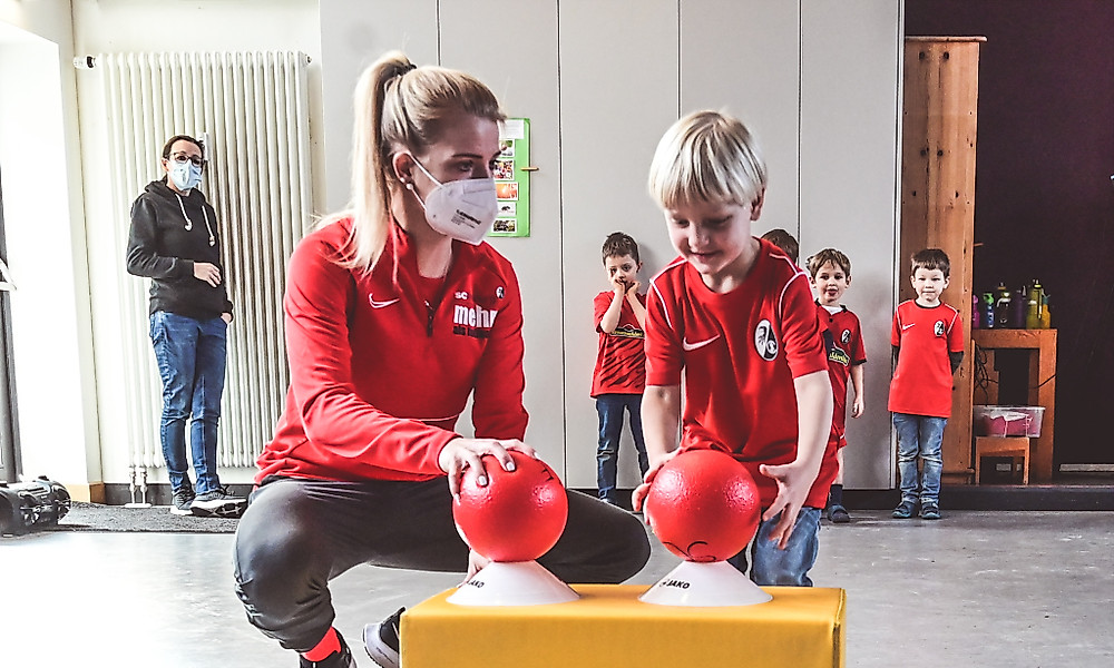 Bundesliga-Spielerin bei den SC Freiburg Frauen und gleichzeitig Trainerin der Mini-Ballschule des Sport-Club: Einblicke in einen Tag mit Kim Fellhauer beim Training im Kindergarten St. Carolus im Sport-Quartier Littenweiler-Waldsee.