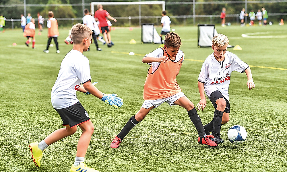 Uns war wichtig: Alle Kinder müssen möglichst immer zum Spielen kommen, statt lange auf Spielzeit zu warten. Nach einem Training oder Spieltag soll jedes Kind verschwitzt, mit rotem Kopf und lächelnd heimgehen. Zudem sollte man Kinder kognitiv adäquat fordern. Unsere Wettkampfform Drei gegen Drei mit Torhütern ist für Fünf- bis Achtjährige die passende, da sie hier ständig Ballaktionen haben und ins Dribbling gehen können. Das ist wichtig, weil die Lernpsychologie uns sagt: Fünf- bis Zehnjährige sind im entscheidenden Lernalter, speziell was das Dribbeln angeht.