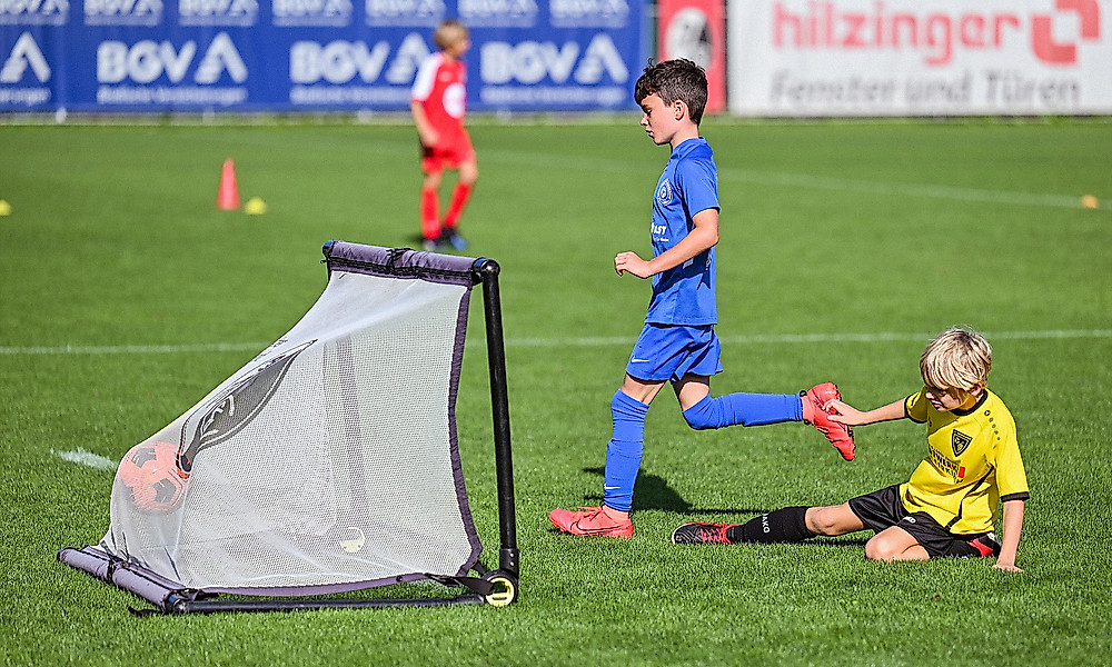 Von morgens bis zum Nachmittag rollt auf dem Trainingsplatz der SC-Frauenabteilung beim E-Jugendturniertag auf drei Doppelspielfeldern der Ball. Das bietet allen Kindern einer Mannschaft maximale Einsatzzeit. Eins von mehreren Zielen, das der Sport-Club und der SBFV im Rahmen ihrer Kooperation und ihres Engagements für den Kinderfußball in der Region umsetzten wollen. Denn die Spielformen, die im G- und F-Jugendbereich seit der vergangenen Saison auf Verbandsebene auch im Spielbetrieb praktiziert werden, sollen vor allem kindgerecht sein, den Spaß am Spiel steigern und allen zugute kommen.