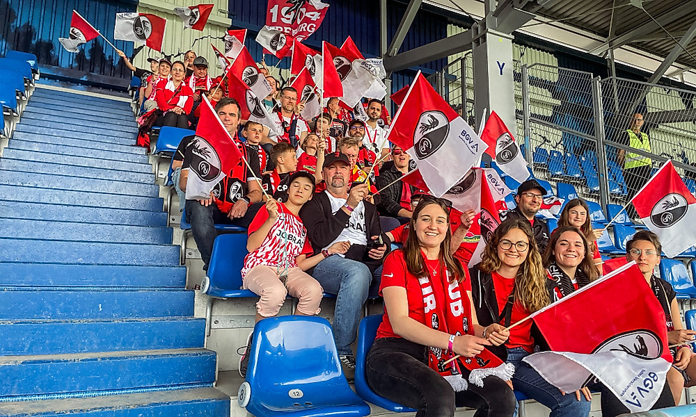 Mit dabei: 25 Kinder aus dem Füchsleclub, ihre Begleitpersonen und zwei Mitarbeitende des SC Freiburg, die sich schon während der Fahrt mit „SC Freiburg vor“ und dem „Badnerlied“ lautstark warmsangen.