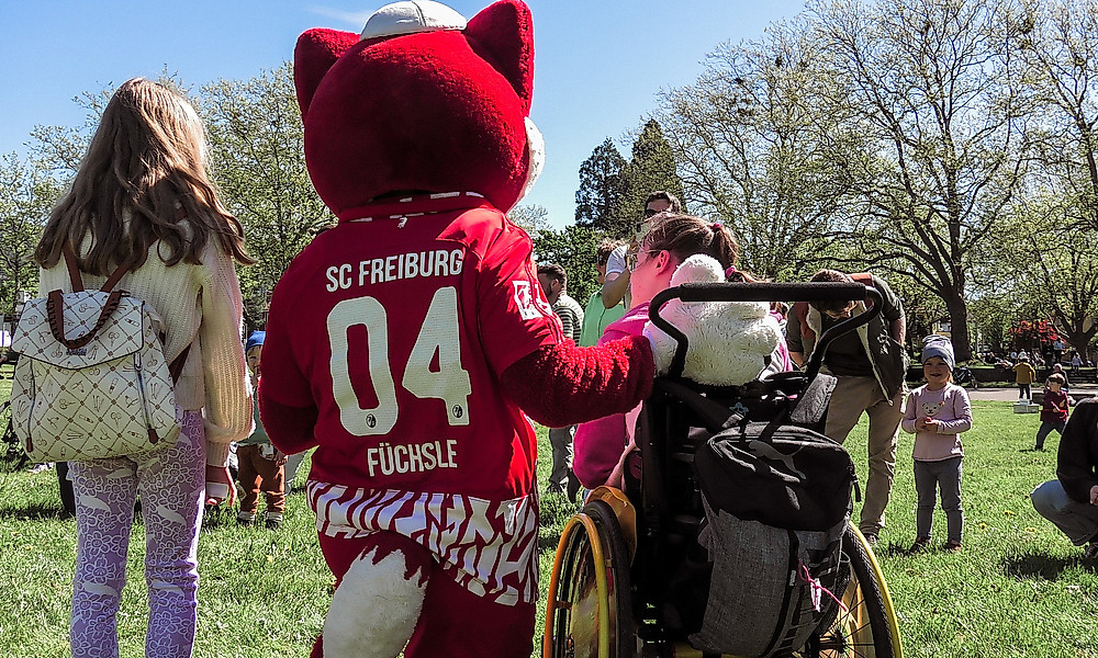 Und auch das Füchsle, das Maskottchen des SC Freiburg, ließ sich bereitwillig seine großen Augen verbinden und versuchte mit seinen riesigen Füßen, den Ball ins Tor zu bugsieren.
