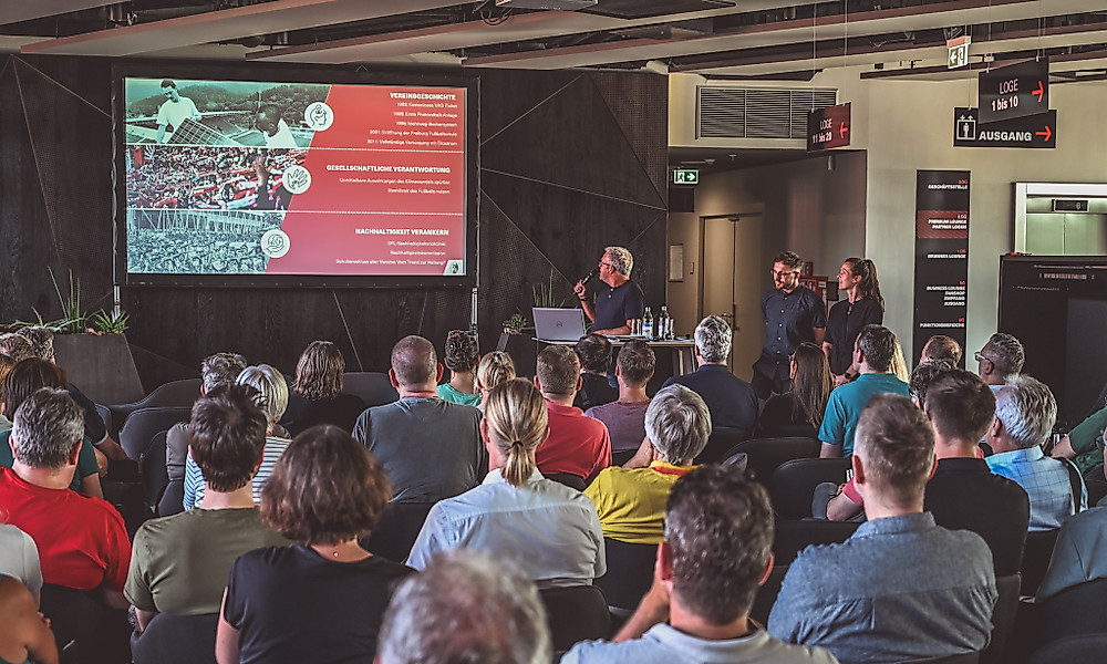 Hanno Franke, Abteilungsleiter Marketing & Nachhaltigkeit, Tobias Rauber, Leiter Nachhaltigkeit & Gesellschaftliches Engagement sowie Anna Beck, erste Nachhaltigkeitsbeauftragte des Vereins, leiteten durch das Forum. Die Mehrheit der Anwesenden erklärte zum Start: "Nachhaltigkeit ist für mich ein Herzensthema." Beim Thema Nachhaltigkeit ist der Sport-Club schon gut aufgestellt, wenn natürlich auch immer noch mehr möglich ist. Aber laut einer Umfrage in der fußballinteressierten Bevölkerung, wie nachhaltig die Vereine der Bundesliga arbeiten, ist das Ergebnis für den SC motivierend: es belegt, dass mit zunehmender Verbundenheit zum SC Wert auf ein umweltbewusstes Verhalten der Vereine gelegt wird.
