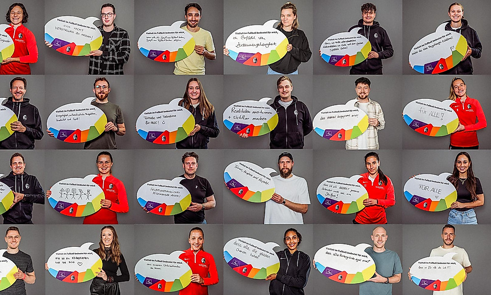In Form einer gemeinsamen Diversity Challengehaben die drei Fußballclubs hierzu ihre Mitarbeitenden zu einer konzertierten Fotoaktion für Vielfalt am Arbeitsplatz Fußball aufgerufen. Die Mitarbeitenden der drei Clubs konnten auf einem Schild den Satz „Vielfalt im Fußball bedeutet für mich…“ vervollständigen und sich anschließend mit der individuellen Botschaft fotografieren lassen. Entstanden ist daraus ein bunter Mix aus Statements in weit über 60 Porträts von Mitarbeitenden der Clubs aus unterschiedlichsten Abteilungen und Fachbereichen in Freiburg, Hamburg und Wolfsburg.