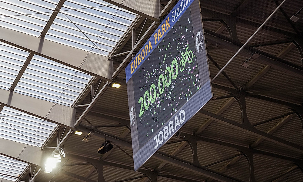 Seit März 2023 präsentiert SC-Hauptsponsor JobRad die Fahrrad-Fan-Zahl im Europa-Park Stadion. Beim Sieg gegen die TSG Hoffenheim wurde die 200.000er-Marke geknackt.