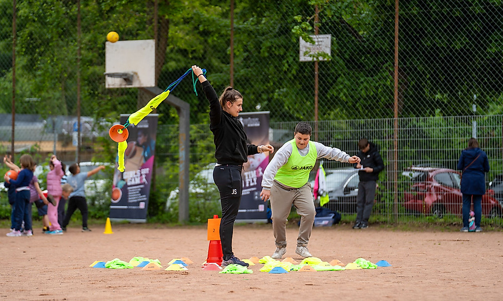Auf dem Bolzplatz an der Albert-Schweitzer-Schule im Stadtteil Landwasser herrschte am Mittwoch pure Lebensfreude. Über 100 Kinder und Jugendliche umdribbelten Hütchen, warfen Körbe oder versuchten sich beim Tauziehen.