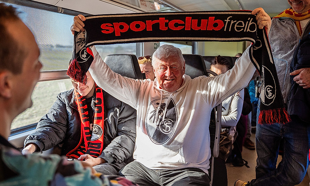 Allein sitzt Klaus Goldo an Heimspieltagen des SC Freiburg nicht im Zug. Je näher er Freiburg kommt, desto mehr SC-Anhänger steigen ein, die an Schals, Trikots, Mützen und Fahnen zu erkennen sind. Zwei junge SC-Fans zum Quasseln hat Klaus Goldo gefunden, nachdem sie in seiner Vierersitzgruppe platzgenommen haben. Der gebürtige Freiburger liebt Geschichten von früheren Besuchen im Dreisamstadion, SC-Fan ist er nämlich schon seit Geburt an, wie er sagt. Nachdem er Ende der 70er-Jahre aus beruflichen Gründen nach Offenburg gezogen war, blieb er dem Sport-Club weiter treu, fuhr weiterhin zu fast jedem Heimspiel, bis auf wenige Ausnahmen stets mit den öffentlichen Verkehrsmitteln. Damals eben noch via Freiburger Hauptbahnhof Richtung Osten, nach Littenweiler ins Dreisamstadion. Sein liebster Trick war, nach Abpfiff auf der gegenüberliegenden Seite in die Straßenbahn einzusteigen, um an der Endhaltestelle Laßbergstraße drin zu bleiben, also einen sicheren Sitzplatz zu haben, wenn die Linie 1 wieder Fahrt aufnahm und auf dem Weg zum Hauptbahnhof die Scharen an SC-Fans einsammelte. „ÖPNV“, sagt Klaus Gordo, sei schon immer sein liebstes Verkehrsmittel gewesen. „Da kann man entspannt mitfahren, hat keinen Stress, erlebt etwas, trifft Menschen.“