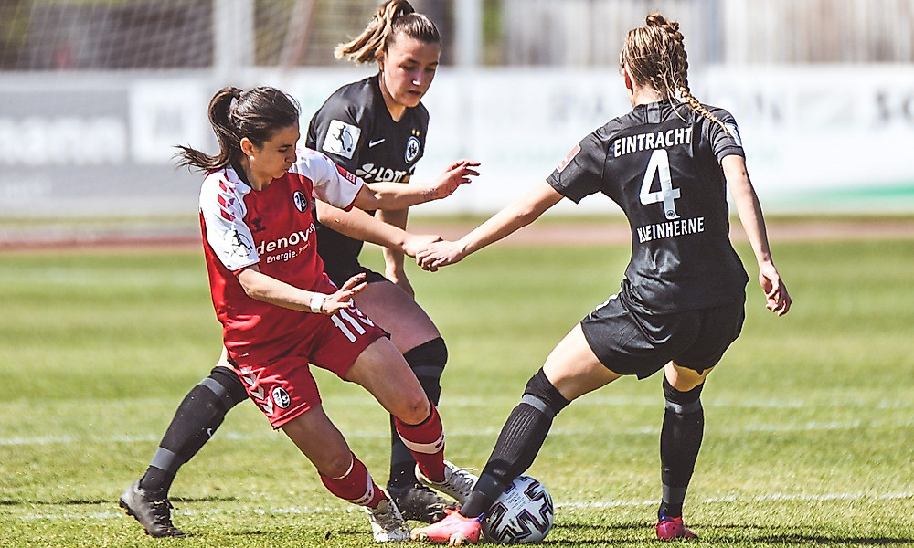 Bei frühsommerlichen Temperaturen und strahlendem Sonnenschein im heimischen Möslestadion in Freiburg, entwickelte sich von Beginn an eine muntere Partie mit viel Tempo auf beiden Seiten. Es waren gerade einmal drei Minuten gespielt, da lag der Ball das erste Mal im Netz der Freiburgerinnen. Nach Ballgewinn von Sjoeke Nüsken ging es schnell auf Frankfurter Seite. Die brandgefährliche Laura Freigang zog aus aussichtsreicher Position ab, doch SC-Torhüterin Elvira Herzog entschärfte deren Rechtsschuss. Den zweiten Ball verwertete Stürmerkollegin Laura Prasnikar zur vermeintlichen Gästeführung. Der Treffer wurde jedoch von Schiedsrichterin Melissa Joos aufgrund eines Foulspiels an Herzog nicht gegeben.