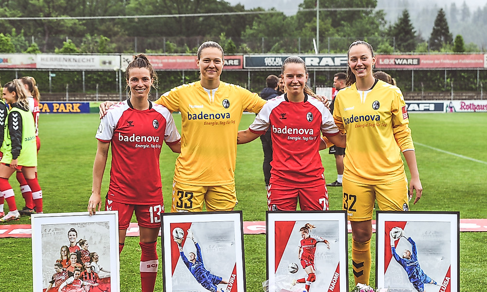 Mit Blumengrüßen, einem sehr guten Tropfen vom Kaiserstuhl und Bildern aus ihrer Zeit hier in Freiburg haben Sportvorstand Jochen Saier und Managerin Birgit Bauer nach dem Saisonfinale gegen den SV Meppen Sandra Starke, Elvira Herzog, Naomi Mégroz und Luisa Palmen verabschiedet. Und auch bei Muriel Kroflin hieß es zumindest vorerst Abschied nehmen. Die 17-Jährige wechselt leihweise in die USA.