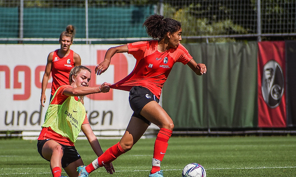 Aufgrund der hohen Temperaturen und der Belastungssteuerung entschied sich das Trainerteam um Theresa Merk, den ersten Test-Kick auf 2x 30 Minuten, ein kleineres Spielfeld und neun Feldspielerinnen zu reduzieren. Gespielt wurde der verkürzte interne Test direkt auf dem Trainingsgelände am Dreisamstadion. Team "Gelb" bildeten Lena Nuding, Jana Vojteková, Greta Stegemann, Samantha Steuerwald, Alina Axtmann, Meret Felde, Mia Büchele, Selina Vobian, Giovanna Hoffmann und Sury Pallotta (U20). Team "Rot" stellte sich aus Rafaela Borggräfe, Annalena Heck (U20), Janina Minge, Luisa Wensing, Lisa Karl, Alina Bantle, Hasret Kayikci, Cora Zicai, Melina Reuter und Marie Müller zusammen.