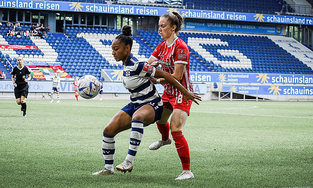 Beim MSV Duisburg trat die Elf von Theresa Merk gegen eine Auswahl an, für die es drei Spiele vor Schluss durchaus noch um viel ging. Gerade mal zwei Punkte trennten die Duisburgerinnen vom ersten Abstiegsrang – die Verfolger Meppen und Köln sogar am selben Tag im Direktduell. Bereits in der dritten Minute erspielten sich die Gäste aus Freiburg ihre erste ganz dicke Gelegenheit: Ein steiles, präzises Anspiel von Kapitänin Hasret Kayikci findet Giovanna Hoffmann mutterseelenallein vor MSV-Torfrau Ena Mahmutovic. Ebendieser gelang es dann jedoch leider, das Duell mit Hoffmann vor dem Kasten für sich zu entscheiden. Trotz dieses ersten Ausrufezeichens flachte die Partie in der Folge etwas ab, beide Teams zeigten sich bedacht in ihrer Herangehensweise.