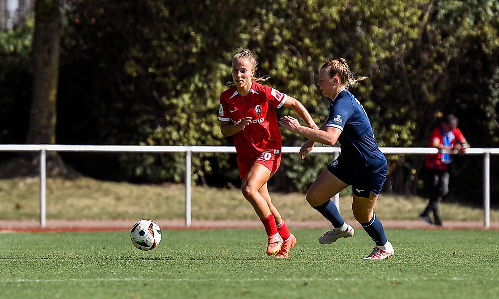 Die Bochumerinnen zeigten von Beginn an, wer Favorit der Begegnung sein sollte. Doch der SC konnte die Drangphase der Gastgeberinnen überstehen und mit dem ersten eigenen Angriff prompt auf 1:0 stellen: Jule Bianchi bediente über die rechte Außenbahn die in den Strafraum eingelaufene Annalena Heck, die den Sport-Club früh in Führung brachte (4.). In der Folge dominierte der VfL die Partie, konnte aber aus zahlreichen Chancen nur wenig machen. Anna Marques scheiterte gleich mehrfach an Julia Kassen im Freiburger Tor, ehe ihr kurz vor der Pause doch noch der Ausgleichstreffer zum 1:1 gelang (45.+4). Auch im zweiten Durchgang übten die Gastgeberinnen viel Druck auf den SC aus, die Elf von Amin Jungkeit konnte sich nur selten effektiv befreien, überstand aber Powerplay und Chancenwucher des VfL lange Zeit. Nach 65 Minuten drehten die Bochumerinnen jedoch durch Lucy Karwatzki die Partie – in der im Anschluss beide Teams keine nennenswerten Möglichkeiten mehr verzeichnen konnten. „Ich glaube, dass es eine ordentliche Mannschaftsleistung war. Bochum hat es stark gespielt und wird sicherlich eine gute Rolle in der Liga einnehmen“, so Jungkeit.