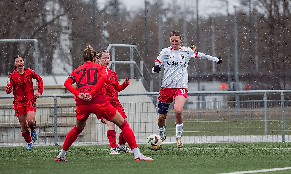 Den besseren Start erwischten die Freiburgerinnen: Von einem Abspielfehler in der Münchner Hintermannschaft konnte Freiburgs Leonie Lorenz zwar profitieren, den Ball allerdings nicht im FCB-Tor unterbringen. Der Sport-Club zeigte sich im ersten Durchgang zwar spielbestimmender, konnte aus dem eigenen Ballbesitz aber zu wenig Torgefahr ausstrahlen. Erste Annäherungen gelangen Victoria Ezebinyuo (22., 27.) und Mia-Lena Maas (30.), die beste Chance hatte dann Charlotte Schmit im Eins-gegen-Eins vor FCB-Keeperin Mala Grohs auf dem Fuß, verpasste jedoch die Führung (31.).