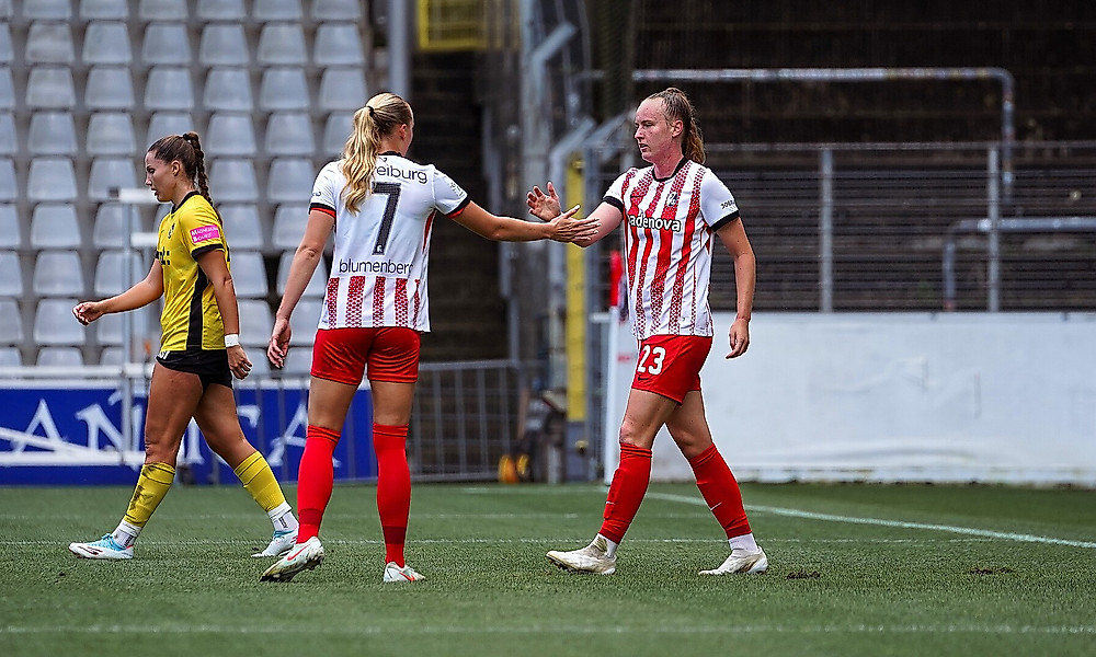 Nach einem gegenseitigen Abtasten in den Anfangsminuten nahm der SC schnell das Zepter in die Hand und gestaltete die Partie gegen die Schweizerinnen im eigenen Wohnzimmer. Schon nach rund fünf Minuten hätten die Gäste aus Bern fast einem Rückstand hinterherlaufen müssen: Eine Ecke von Selina Vobian fand den Kopf von U20-Spielerin Luisa Jansen, die allerdings nur den Außenpfosten traf. Auch Alena Bienz und Tessa Blumenberg prüften YB-Keeperin Tamara Biedermann in der Folge aus der Distanz – ohne Abschlussglück (10., 20.).