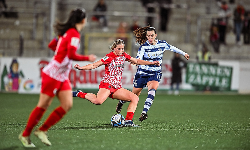 Schon das Hinspiel zwischen dem Sport-Club und dem MSV bedeutete im vergangenen Herbst Drama: Damals glich Antonia Halverkamps für die Zebras in letzter Sekunde zum 2:2 aus, das Rückspiel im Dreisamstadion sollte am Sonntagabend eine ähnliche Dramaturgie nehmen: Janina Minge rettete ihren Freiburgerinnen in der vierten Minute der Nachspielzeit noch einen Punkt – doch für beide Teams fühlte sich das 1:1 wie eine Niederlage an. Duisburg bleibt mit nun drei Zählern unverändert Tabellenletzter, der SC rückt durch zwei verschenkte Punkte aber ebenfalls wieder näher an die Abstiegszone heran. Trainerin Theresa Merk sagte daher nach dem Spiel auch: „Wir sind wahnsinnig enttäuscht. Wir wollten uns nach dieser englischen Woche unbedingt belohnen, auch für ein gutes Spiel in Frankfurt. Wir nutzen die frühen Chancen nicht. Je länger so ein Spiel Unentschieden steht, desto mehr lässt man den Gegner auch wieder rankommen.“