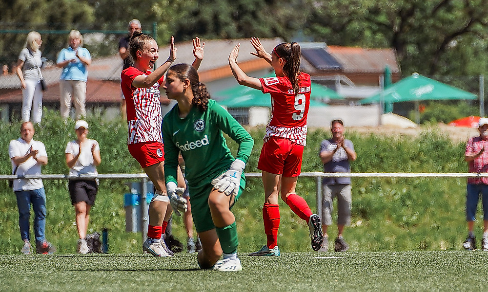 Die U20-Frauen des Sport-Club festigen die Tabellenspitze der Regionalliga Süd eindrucksvoll: Gegen die Frankfurter Eintracht siegt das Team von U20-Trainer Amin Jungkeit mit 7:0 und ist weiterhin auf dem besten Weg in Richtung 2. Frauen-Bundesliga. Schon nach drei Minuten brachte Jule Bianchi ihre Freiburgerinnen in Führung, sechs Minuten später erhöhte Charlotte Schmit auf 2:0 (9.) und wiederum vier Minuten danach traf Mia Scholle zum 3:0 (13.). Die Partie im Schönbergstadion war quasi nach nicht einmal einer Viertelstunde entschieden. "Wir wollten den Gegner von Anfang an unter Druck setzen und für klare Verhältnisse sorgen. Das ist uns sehr gut gelungen", freute sich Jungkeit über die souveräne Leistung seines Teams. "Wir haben mit die beste erste Hälfte in dieser Saison gespielt, weshalb das Ergebnis auch in der Höhe verdient ist." Denn der SC hatte nach den drei schnelle Toren noch nicht genug und legte zwei weitere Male im ersten Durchgang nach: Nora Scherer erzielte den vierten Treffer des Nachmittags (23.) und das 5:0 erzielte erneut Jule Bianchi (38.). Der zweite Durchgang gestaltete sich deutlich ausgeglichener, weil nun auch die Frankfurterinnen Gegenwehr leisteten. Zwei weitere Tore durfte der SC trotzdem noch bejubeln: Annalena Heck und Victoria Ezebinyuo schraubten das Ergebnis zum Ende der Partie nochmal höher (82., 87.). "Auf uns wartet nun noch eine letzte schwere Aufgabe, für die unsere junge Mannschaft einen kühlen Kopf braucht: Wir können am Samstag Meisterschaft und Zweitliga-Aufstieg klarmachen", weiß Jungkeit nach dem furiosen 7:0-Erfolg über Frankfurt. "Dazu müssen wir unsere volle Leistung auf den Platz bekommen, hochkonzentriert sein und einfach so Fußball spielen, wie wir es die gesamte Saison über getan haben."