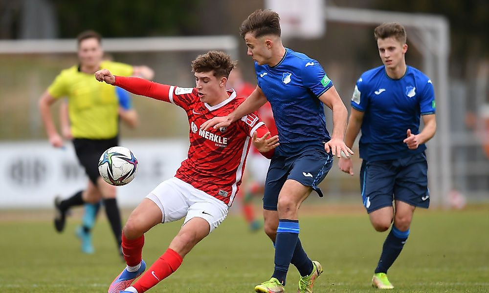 „Ja und nein“, antwortete Federico Valente auf die Frage, ob er mit dem Punktgewinn zufrieden sei. So ganz konnte sich der Trainer des Sport-Club nicht festlegen nach den ersten sehr intensiven 90 Spielminuten des Fußballjahres 2022. Es war ein ordentlicher Brocken, der auf seine A-Junioren des Sport-Club wartete. Zum Nachholspiel vom 6. Spieltag der Bundesliga Süd/Südwest war am Samstagnachmittag die TSG Hoffenheim zu Gast in der Fußballschule. Die Gäste stehen in der Spitzengruppe der Staffel und gehören traditionell zu den Topteams im Süden.
