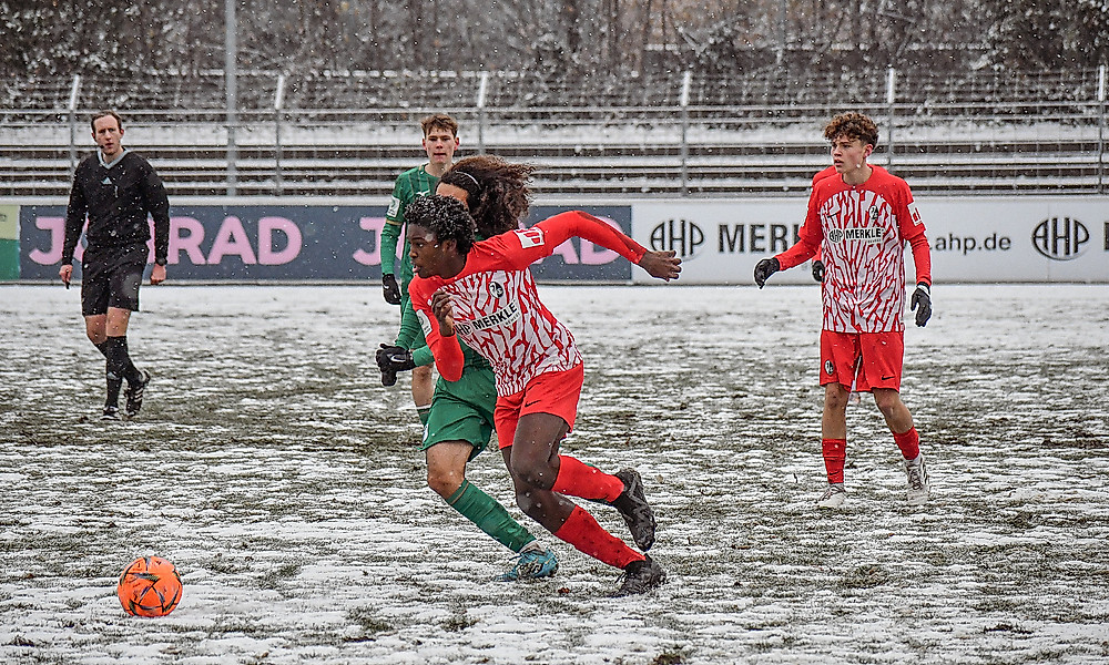 Gegen den FC Augsburg feierte die U17 des SC Freiburg nach Siegen gegen Kaiserslautern und Heidenheim ihren dritten Vollerfolg in der Bundesliga in Folge. Beim 1:0-Heimsieg auf weißem Untergrund war es Mittelfeldakteur Elias Münnich, der in der 31. Minute den einzigen Treffer des Tages erzielte. Inklusive des Spiels gegen die Gäste aus Bayern haben die Breisgauer während ihrer Siegesserie lediglich ein Tor kassiert. Zur Partie sagte Trainer Julian Wiedensohler: „Es war ein hart erkämpfter Heimsieg gegen starke Augsburger bei Schneetreiben, den wir uns vor allem mit viel Fleiß und Aufmerksamkeit gegen den Ball erarbeitet haben.“ Dank den drei Punkten hat die Freiburger U17 die Augsburger in der Tabelle der B-Junioren-Bundesliga Staffel Süd/Südwest nun überholt und den siebten Platz eingenommen. Vor der Winterpause bestreitet die Mannschaft von Trainer Wiedensohler noch zwei weitere Spiele. Zunächst kommenden Sonntag daheim gegen den VfB Stuttgart, sieben Tage später dann auswärts bei Mainz 05.