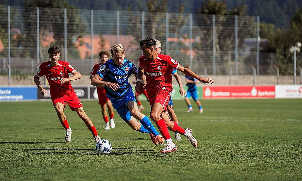 Der erste Durchgang gestaltete sich ausgeglichen. Chancen gab es auf beiden Seiten. Für die Breisgauer brachte Luca Schulten mit dem Kopf das Leder nach etwa einer Viertelstunde in Richtung Tor. Die Hereingabe kam von Robin Maier. Später versuchte Elijah Oguguo sein Glück mit einem gefährlichen Abschluss, der aber von der Abwehr geblockt wurde.
