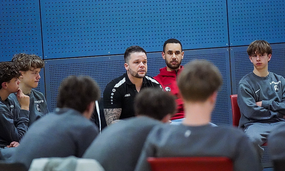 Im Anschluss an die Erzählung von Simon Batta, der 2019 den Simon Batta Jugendcoaching e. V. gegründet hat, verließen die Mitarbeitenden des SC Freiburg bewusst den Raum. „Uns war es wichtig, einen geschützten Rahmen zu schaffen, in dem die Jungs ohne Angst, mitgehört zu werden, Fragen stellen oder von eigenen und familiären Erfahrungen berichten können“, erläutert Klein. Erst dieser Schritt ermögliche einen wirklich authentischen Austausch.