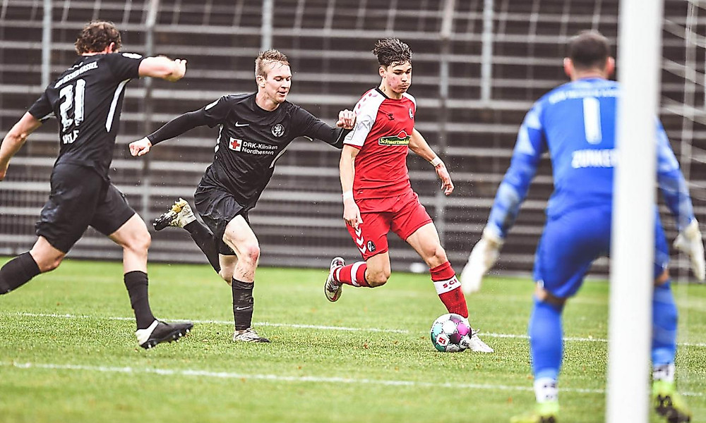 In einer lebendigen Anfangsphase versuchten die Gäste zunächst mitzuspielen. Der SC II erarbeitete sich aber von Beginn an Vorteile und ließ letztlich bis zum Halbzeitpfiff keine nennenswerte Chance für Hessen Kassel zu. Stattdessen dominierte der Sport-Club das Spiel zusehends. Nach ersten Möglichkeiten für Noah Weißhaupt (13.) und Enzo Leopold (20.) brachte eine Standardsituation die verdiente Führung. Einen Freistoß von Kimberly Ezekwem aus dem Halbfeld köpfte Kiliann Sildillia (23.) frei stehend aus kurzer Distanz ein.