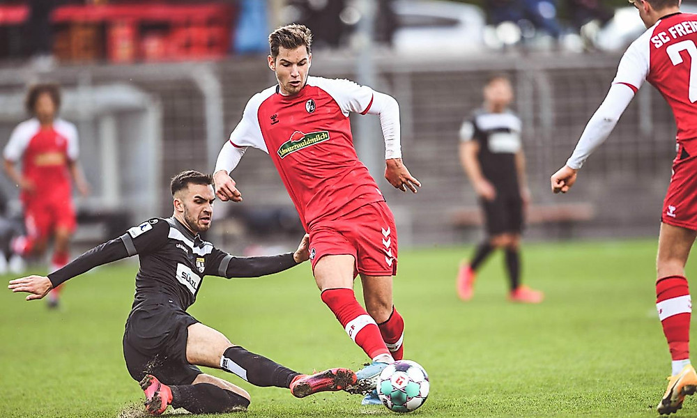 Auch der SC II erspielte sich bereits Gelegenheiten zur Führung, trat insgesamt aber noch nicht druckvoll genug auf. Pieringer und Til verzogen in der Anfangsphase knapp. Nach einem Freistoß von Itter klärte Julian Hauser gerade noch vor Schlotterbeck (22.). Der TSG-Schlussmann parierte auch einen wuchtigen Schuss des dynamischen Konrad Faber, während Kevin Schade nach einer Hereingabe von Keitel seinen Kopfball über die Querlatte setzte (30.).