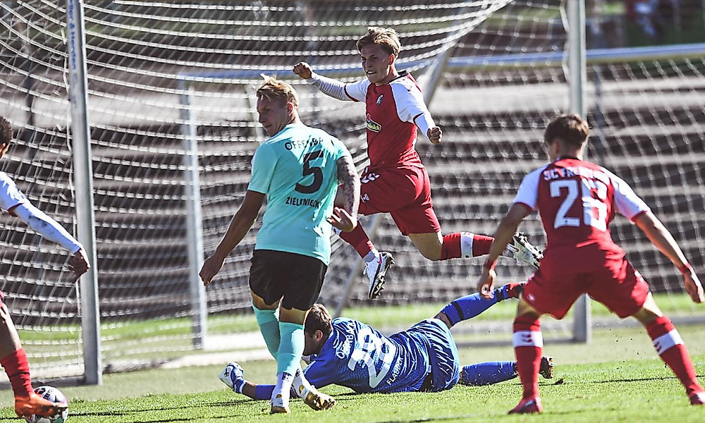 Denn erst in der vorletzten Spielminute hatte Yannik Keitel mit einem sicher verwandelten Foulelfmeter dafür gesorgt, dass der SC Freiburg II auch im sechsten Saisonspiel punktete und damit nach wie vor ungeschlagen ist. Die Unzufriedenheit des Coachs bezog sich darauf, dass das Team, in dem auch SC-Profi Lino Tempelmann Spielpraxis sammelte, in einer äußerst starken ersten Halbzeit von mehreren erarbeiteten Chancen nur eine nutzte.