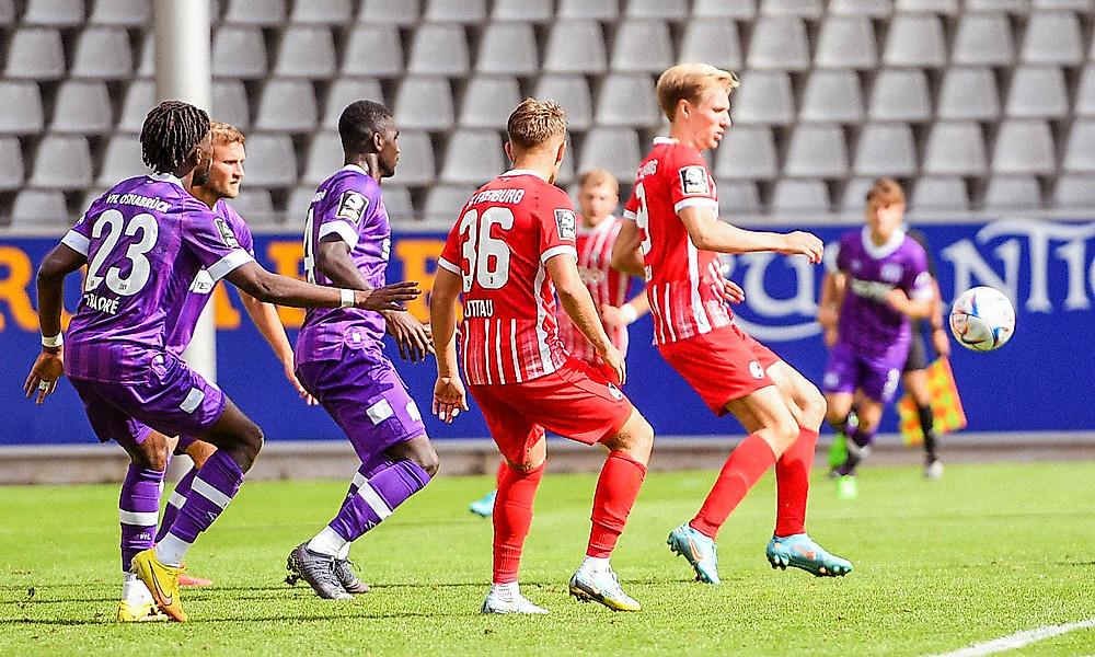 Ein Schuss von Felix Higl (8.) am Tor vorbei und ein weiterer Abschluss von Ba-Muaka Simakala (27.), den Noah Atubolu abwehrte, waren die wenigen Möglichkeiten für Osnabrück. Für den Sport-Club kam nach einem Freistoß Vincent Vermeij (32.) zum Kopfball, der knapp über die Latte strich. Ansonsten bearbeiteten sich zwei gut organisierte Mannschaften meistens wirkungsvoll und ließen bis zur Pause kaum Chancen zu.