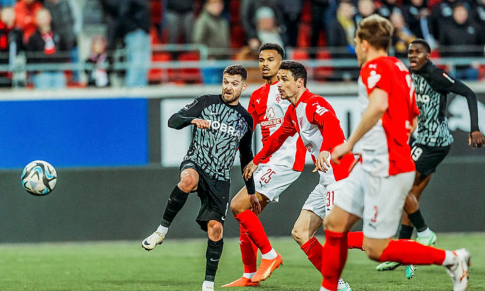 Doch die Partie hielt ihren Tor-Rhythmus zunächst konstant aufrecht. Erneute drei Minuten später führte Halle zum zweiten Mal. Einen abgelegten Ball von Tarsis Bonga platzierte Dominic Baumann (26.) aus rund 24 Metern mit einem Heber über den weit vor dem Tor stehenden Schneller unter die Querlatte.