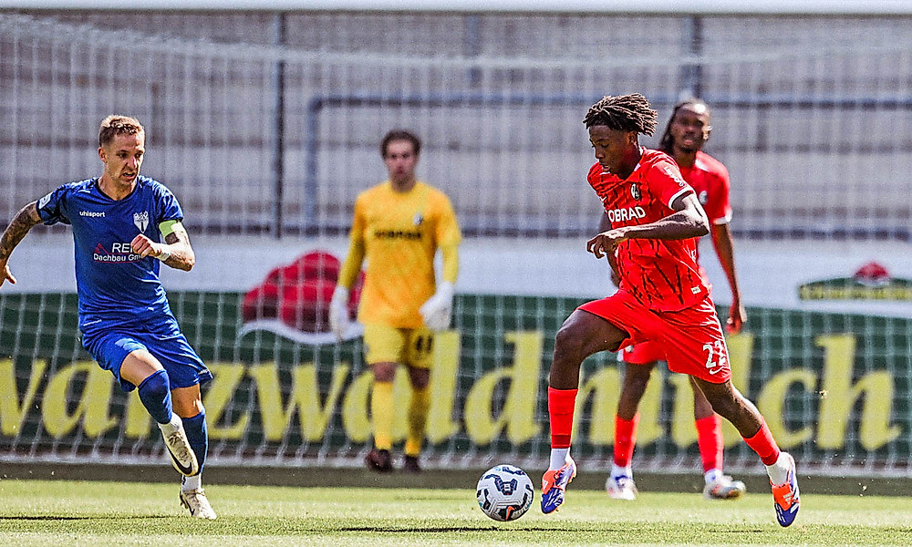 Die nächste Chance leitete Weißhaupt über die linke Seite ein und Johan Manzambi (16.) nutzte das zum Führungstreffer. Im Strafraum zog der 18-Jährige noch an einem Gegenspieler vorbei und traf aus spitzem Winkel so kunstvoll wie sehenswert hoch in die lange Ecke. Der SC II hatte sich inzwischen gegen die erfahrenen Gäste auch die Spielkontrolle erarbeitet. Nach einem Solo von Weißhaupt (19.) verhinderte Gelt den zweiten SC-Treffer.