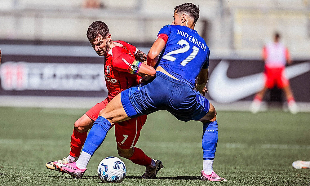 Auch das zweite Duell mit einer zweiten Mannschaft in dieser Saison begann trotz nach wie vor hochsommerlicher Temperaturen temporeich – und mit frühen Chancen. Einen Schuss von Ruben Müller (2.) lenkte TSG-Torwart Eric Verstappen zur Ecke. Auf der Gegenseite traf Milan Rehus aus der Distanz den Innenpfosten. Einen weiteren Angriff nutzten die Gäste dann zur frühen Führung. Eine abgewehrte Flanke verwertete TSG-Verteidiger Hennes Behrens (11.) mit einem Direktschuss in die linke Ecke. „Wir wussten, dass Hoffenheim Pressing spielt, haben den Ball aber trotzdem ins Zentrum geklärt“, so Muzzicato.