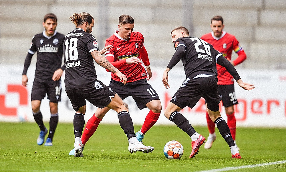 Nach einer ereignislosen Anfangsphase profitierten die Gäste von einem Fehler in der Freiburger Defensive. Im Anschluss an einen Rückpass vor das eigene Tor schoss Benjamin Uphoff den heranstürmenden Bashkim Ajdini an, von dessen Körper der Ball ins Netz trudelte (9.).