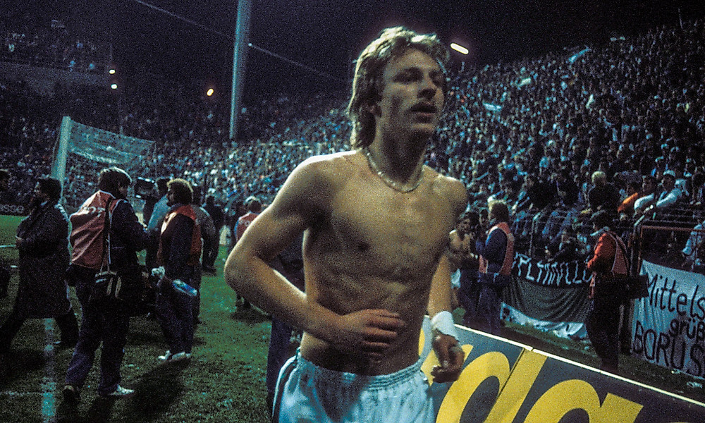 Wie das Foto zeigt, war 1986 nicht nur die Stimmung anders: Mit Halskette dürfte man heute nicht mehr kicken. Zudem lässt man Profis nach einer Partie im Dezember nicht mit nacktem Oberkörper rumlaufen, sondern packt sie gleich in dicke Jacken. Hinter mir rechts sieht man da übrigens Uli Borowka, damals Manndecker der allerhärtesten Sorte. Ich selbst bin 20 Jahre alt und voller Adrenalin nach einem 0:0 mit der Borussia gegen die Glasgow Rangers.