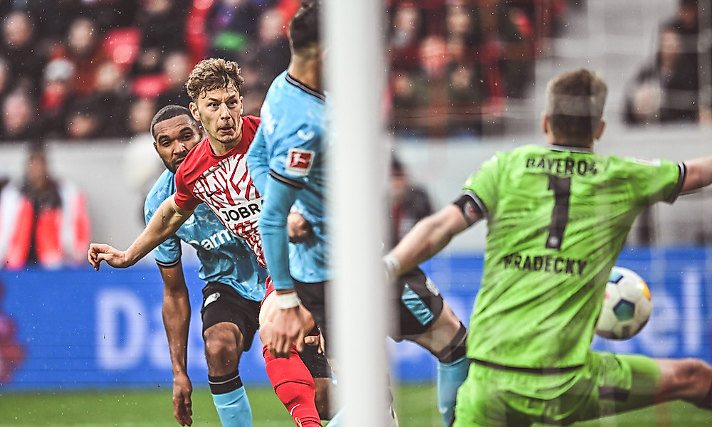 Der Sport-Club machte es dem Tabellenführer richtig schwer, spielte mutig, war in jedem Zweikampf hellwach, erspielte sich Torchancen. Nach einer guten halben Stunde fand Bayer wieder besser in sein ballsicheres Spiel zurück, kam aber kaum zu Torabschlüssen, weil der SC in den Zweikämpfen giftig und aufmerksam blieb. Und dennoch ging Leverkusen wieder in Führung. Noah Atubolu bekam einen Ball im Nachfassen nicht zu packen, Adam Hlozek stand frei vor dem Tor und traf zum 1:2 (40.).