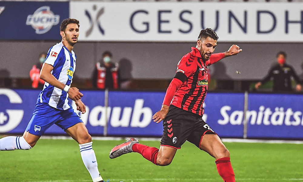 In der noch ausgeglichenen Begegnung erarbeitete sich der SC dafür Mitte der ersten Halbzeit drei gute Gelegenheiten zur Führung in Folge - jeweils nach Eckbällen von Vincenzo Grifo. Zunächst köpfte Robin Koch knapp am Torwinkel vorbei (21.). Eine Minute später versuchte es Sallai mit einem Linksschuss, doch Jordan Torunarigha warf sich dazwischen und fälschte zum nächsten Eckball ab. Diesen verlängerte Nicolas Höfler (22.) gefährlich Richtung Tor, aber erneut bekam ein Herthaner noch den Fuß dazwischen und klärte.