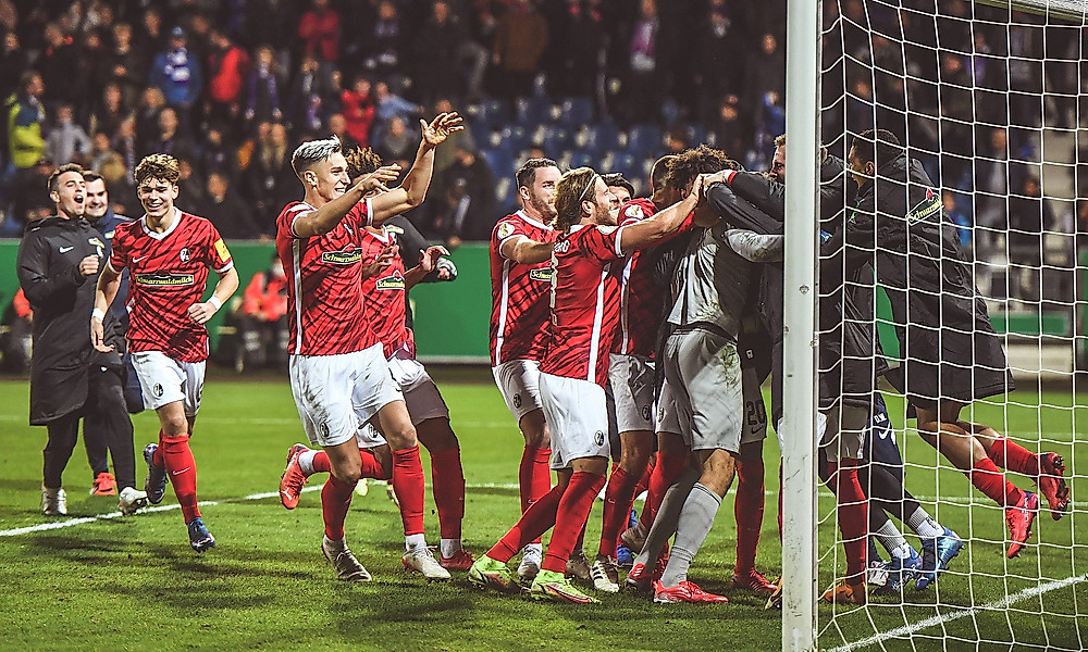 Noch 600 Kilometer bis Freiburg. An Schlaf ist trotz vorgerückter Stunde nicht zu denken. Auf der A1 Richtung Süden läuft für uns die Verlängerung der Verlängerung der Verlängerung, die irgendwann gegen 6 Uhr morgens ihr Ende finden wird. Vor meinem inneren Auge spielen sich einzelne Szenen des vorangegangenen Pokal-Abends in Osnabrück ab, die stets direkt von neuen Bildern überlagert werden: Die Fan-Tankstelle ein gutes Stück abseits des Stadions, an der man seine Akkreditierungen abholen musste; ein Schlenzer aus fiesem Winkel von Vince zur Führung; der aufgepeitschte Heim-Stehblock an der Bremer Brücke, der mit dem Ausgleich von Lukas Gugganig vollkommen eskaliert; die Schlotterbecks in heftigen Zweikämpfen mit Opoku, Higl und Co.; ein schön herausgespieltes Kontergegentor in der 108. Minute; Keven Schlotterbeck mit seinem Jubel vor den mitgereisten SC-Fans nach dem 2:2 in der 120. Minute; und schließlich immer wieder in Endlosschleife: Die gehaltenen Elfmeter von Benjamin Uphoff und die Freiburger Jubeltraube nach dem so knappen Sieg.