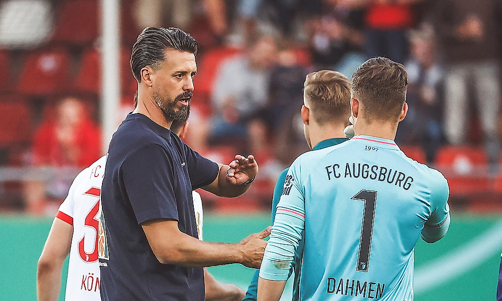 Sein erstes Pflichtspiel endete erfolgreich. Im DFB-Pokal setzte sich Augsburg mit 2:0 beim Halleschen FC durch – mit einem durchaus emotionalen Trainer, der die Partie in der Coachingzone intensiv miterlebte.