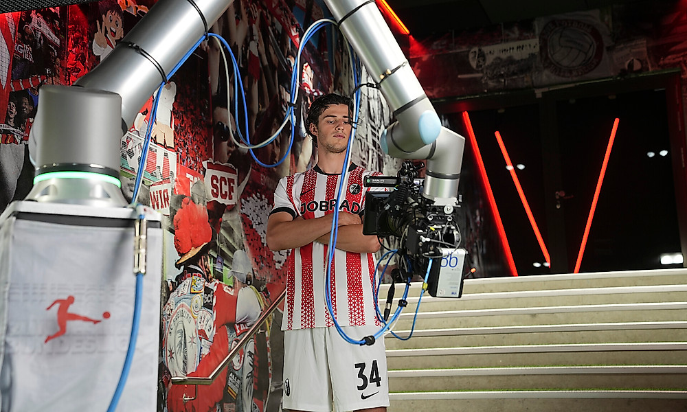 Im Stadioninneren dreht sich Igor Matanovic, für den es der erste Media Day im SC-Trikot ist, in vorgegebene Positionen in Richtung Video-Kamera – eine Station für Einspieler von TV-Sendern. „Der Großteil unserer Aufnahmen ist für internationale Broadcaster“, sagt Hossenfelder, der mit Funkgerät am Shirt immer alles im Blick hat und ausgewählte Spieler zur Station „Trailer“ begleitet, die im Spielertunnel aufgebaut ist. Ein Vorhang dunkelt den Tunnel zusätzlich ab, davor sind die Aufnahmen auf einem Bildschirm zu sehen. „Hier wird unser hochwertigster Content produziert. In diesem Jahr macht ein Kameraroboter 360-Grad-Aufnahmen der Spieler“, beschreibt Hossenfelder. Die Kamera dreht sich gerade um Merlin Röhl. Der entstandene Content wird von allen Clubs, der DFL selbst, Partnern der DFL sowie den TV-Sendern Sky und DAZN genutzt, etwa für die Topmatch-Promotion, also im Vorlauf und zur Ankündigung eines Bundesliga-Topspiels.