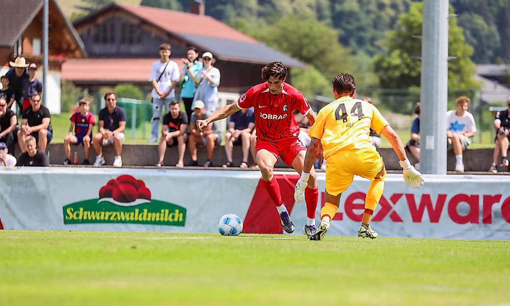 Der Freiburger Anfangsschwung war nach der ersten Trinkpause etwas dahin. Bis auf den dritten Abseitstreffer der Partie durch Yann Sturm tat sich der SC im Spiel nach vorne schwer (36.). Und dennoch war der Führungstreffer kurz vor der Pause durch Junior Adamu verdient. Vincenzo Grifo legte den Ball links im Sechzehner auf den durchstartenden Adamu, der aus halblinker Position ins lange Eck vollendete (41.) – sein zweiter Treffer der Vorbereitung. Wie bereits im ersten Test in Altach hielt die Führung allerdings nicht lange. Mit der letzten Aktion glichen die Gäste durch Dennis Srbeny aus (45.). Atubolu war beim Abschluss aus kurzer Distanz machtlos.