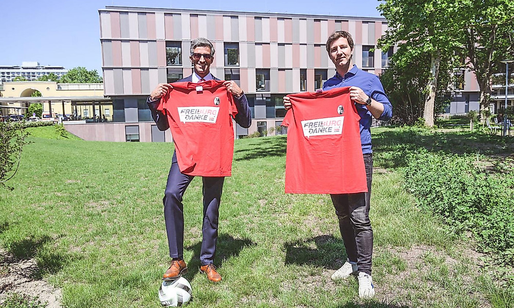 Das Freiburger Universitätsklinikum als Klinikpartner des SC Freiburg trägt dabei die Hauptlast in der Region. Aus diesem Grund übergab SC-Sportvorstand Jochen Saier am Dienstagmittag 1100 T-Shirts mit der Aufschrift „Freiburg sagt Danke“ an den Vorstandsvorsitzenden des Freiburger Universitätsklinikums, Prof. Dr. Frederik Wenz. Zudem erhalten die Mitarbeiterinnen und Mitarbeiter des Universitätsklinikums Freiburg 1100 Eintrittskarten für die Saisoneröffnung des Sport-Club im neuen Freiburger Stadion.