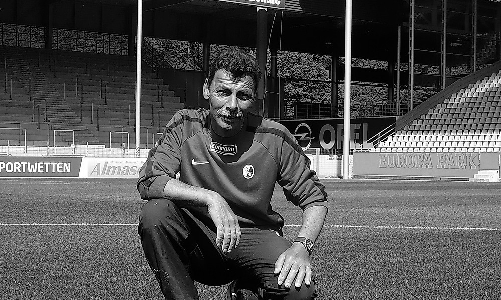 Wenn man morgens auf den Parkplatz des Dreisamstadions fuhr, war Carmine schon da. Meistens hörte man ihn schon von Weitem, wie er auf seinem fahrbaren Untersatz um die Ecke bog. Der hagere Kerl mit seinem übergroßen Schnurbart und dem einnehmenden Grinsen, der die Kollegen im Vorbeifahren grüßte. Auf dem Weg von der einen Tribüne zur nächsten, wo es etwas zu reparieren, auszubessern oder abzuschließen gab.