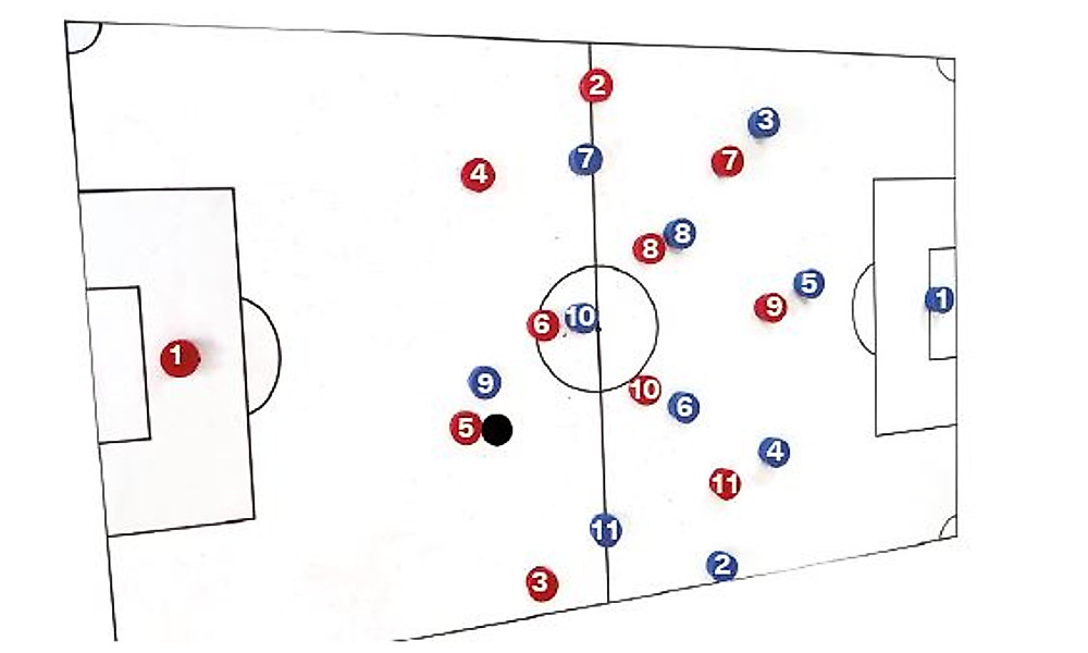 Nein, das wäre ja eher „kopieren“. Beim Spiegeln wählst du die taktische Grundordnung so, dass sich insbesondere im Mittelfeldzentrum Eins-gegen-Eins-Zuordnungen ergeben. Beispiel: Spielt der Gegner 4:2:3:1, also mit zwei „Sechsern“ und einem „Zehner“, könnte man mit einer 4:1:4:1-Grundordnung mit einem „Sechser“ und zwei „Achtern“ spiegeln, um so im Mittelfeldzentrum Eins-Eins-Duelle zu bekommen: unser „Sechser“ gegen deren „Zehner“ und unsere beiden „Achter“ gegen deren zwei „Sechser“. Heißt: Die Zuordnungen ergeben sich quasi von selbst, wenn man die taktischen Systematiken übereinander legt.