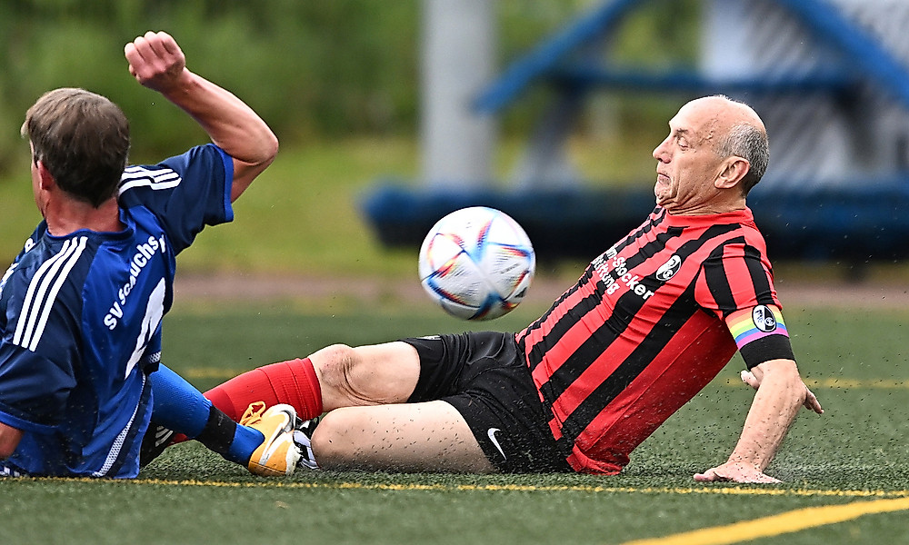 Der TuS Bonndorf feiert 150-jähriges Jubiläum - ein stolzes Alter! Als Gratulant kommt die Traditionsmannschaft des Sport-Club in die Löwenstadt und ist dabei sehr breit aufgestellt. Daniel Schwaab hat mit seinen 33 Jahren das beste Fußballalter erst ein paar Tage hinter sich. Teamkollege Norbert Martinelli verkörpert mit seinen 71 Jahren dagegen die ganz frühen SC-Profijahre. Von 1975 bis 1979 war der Linksaußen für den Sport-Club in der 1. Amateurliga und der 2. Bundesliga am Start. Im DFB-Pokal 1975 traf er bei der 8:2-Niederlage beim 1. FC Köln. Von dieser Partie flimmerten übrigens die ersten SC-Bilder im deutschen Fernsehen. Den Spielbericht wollen wir nicht vorenthalten.