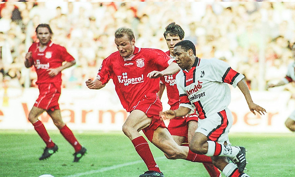 Ein größeres Highlight war nur das letzte deutsch-deutsche Uefa-Cup-Duell: mit dem Chemnitzer FC gegen Borussia Dortmund, 1990. Das Rückspiel fand am 2. Oktober statt, einen Tag vor der Wiedervereinigung. 1991 hab ich dann mit dem CFC übrigens zweimal innnerhalb von sieben Tagen in Freiburg gespielt: Im DFB-Pokal haben wir gegen den Freiburger FC mit Christian Streich 1:3 verloren, beim darauffolgenden 2:1-Sieg beim SC habe ich in meinem ersten Zweitligaspiel gleich ein Tor gemacht. Vor dem Wechsel zum SC hab ich das als gutes Omen genommen. Tja … (schmunzelt)