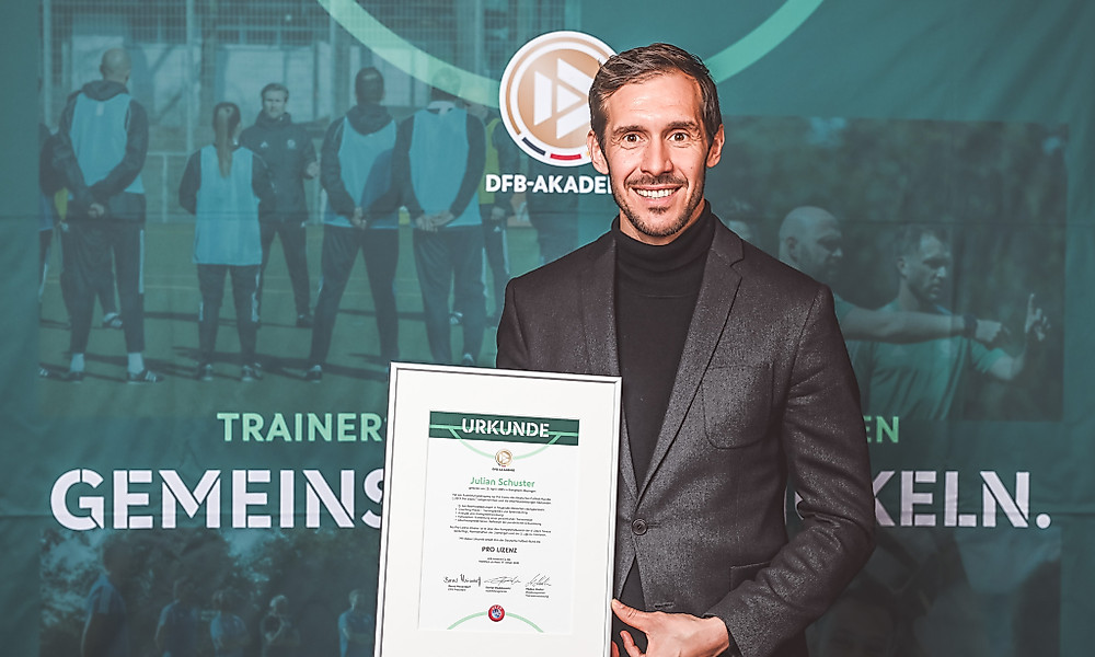 Julian Schuster hat den höchsten Trainerlehrgang im deutschen Fußball, die "Pro Lizenz", erfolgreich absolviert. Mit ihm wurden am Montagabend 15 weitere Absolventen geehrt. "Die Ausbildung war eine prägende Reise meiner persönlichen Entwicklung", erzählt Schuster, der für den Sport-Club insgesamt 185 Mal als Spieler in der Bundesliga auf dem Platz stand und nun als Verbindungstrainer beim Sport-Club arbeitet. Inhalte der einjährigen Ausbildung zur Pro Lizenz waren zahlreiche Besuche bei Profivereinen in Deutschland sowie im Ausland, der Austausch mit namhaften Trainerpersönlichkeiten und natürlich praktische und theoretische Einheiten.