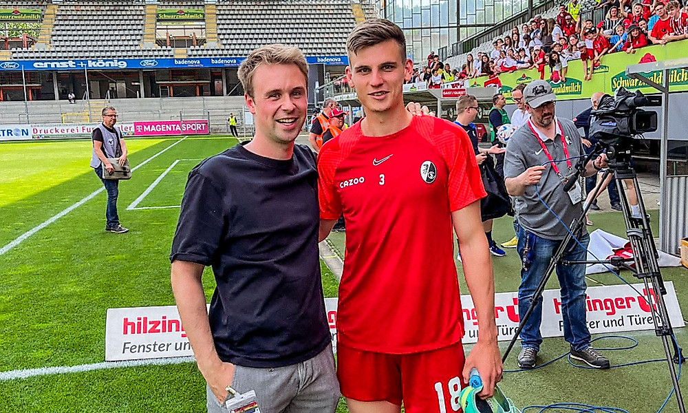 Normalerweise bin ich zwei Stunden vor Spielbeginn vor Ort, heute stehe ich schon um 9 Uhr im Dreisamstadion. Um 13.30 Uhr ist Anpfiff. Trockenübungen stehen an, der Ernstfall „Meisterfeier“ muss geprobt werden. Podest aufbauen, Pokalübergabe, wo steht welche Kamera am besten, wo der Medaillentisch – es ist erstaunlich, über was man sich Gedanken machen muss. Der Pokal wird sicher im Kabinentrakt verstaut. Für mich persönlich ist das ein total surrealer Moment. Ich denke daran, dass wir vor zwei Jahren noch in der Regionalliga gespielt haben.